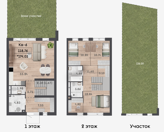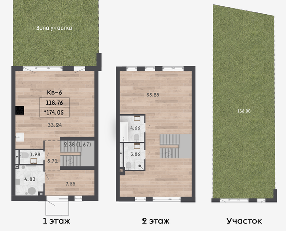 | 118,76 м² Площадь квартиры | 136 м² Площадь участка | 55,29 м² Площадь бонус-этажа |