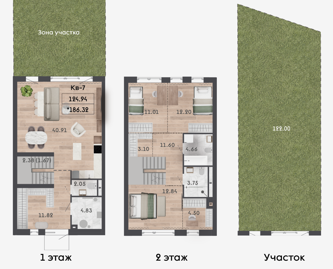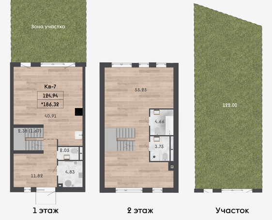 | 118,76 м² Площадь квартиры | 122 м² Площадь участка | 61,38 м² Площадь бонус-этажа |