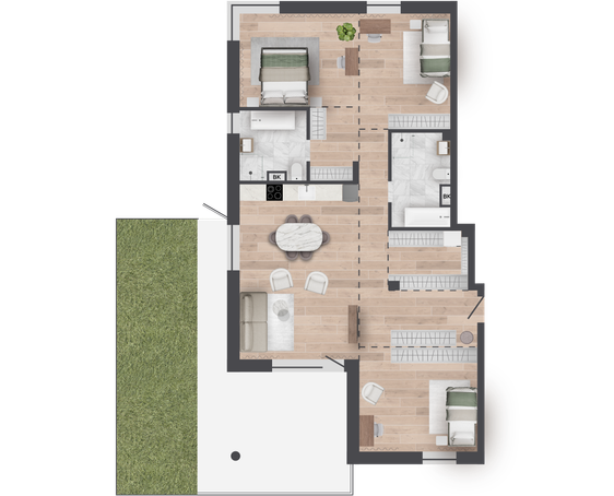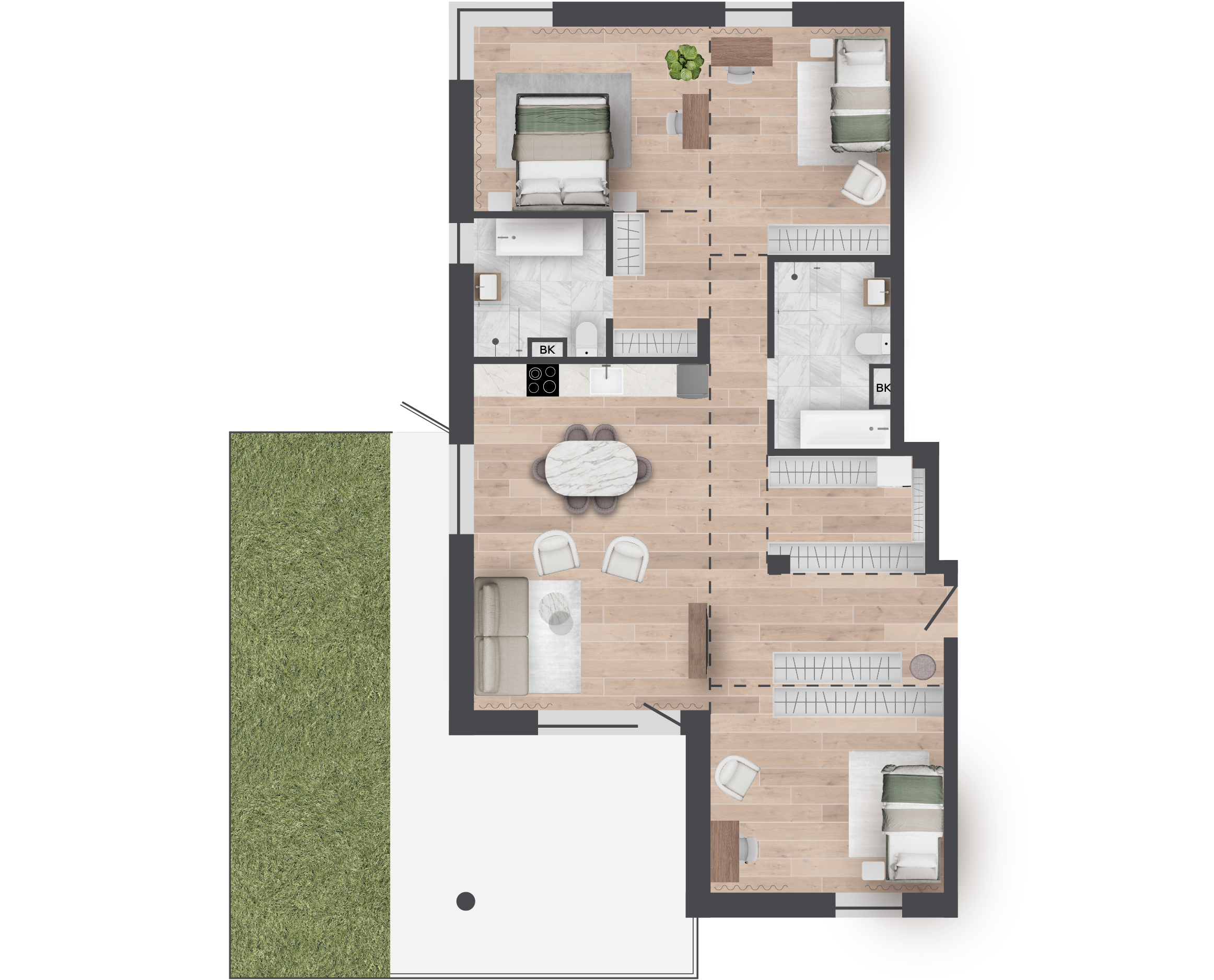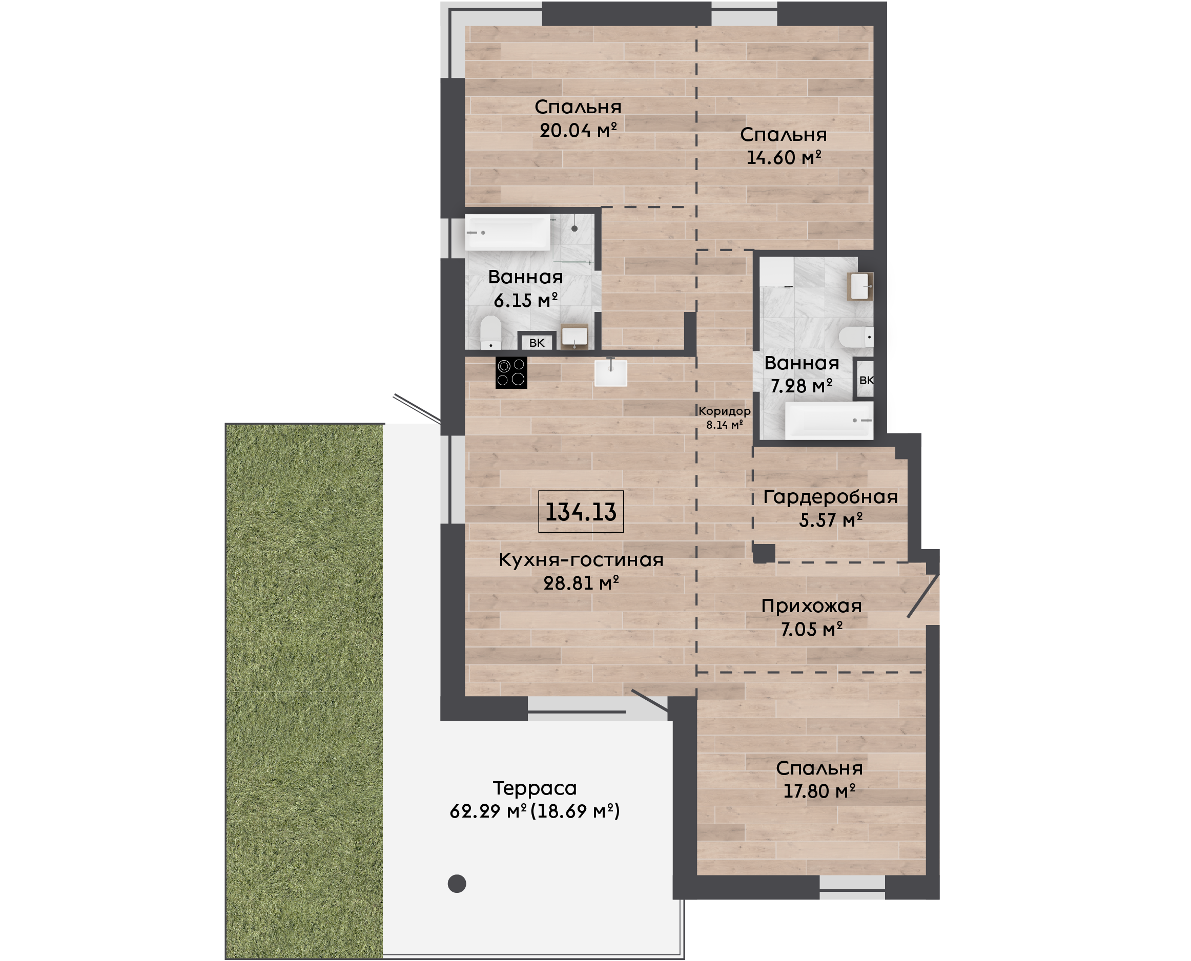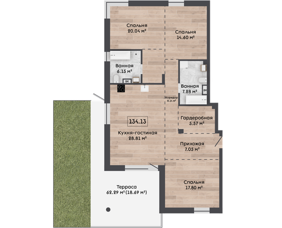 | 134,13 м² Площадь квартиры | 3 м Высота потолков | 62 м² Площадь террасы |