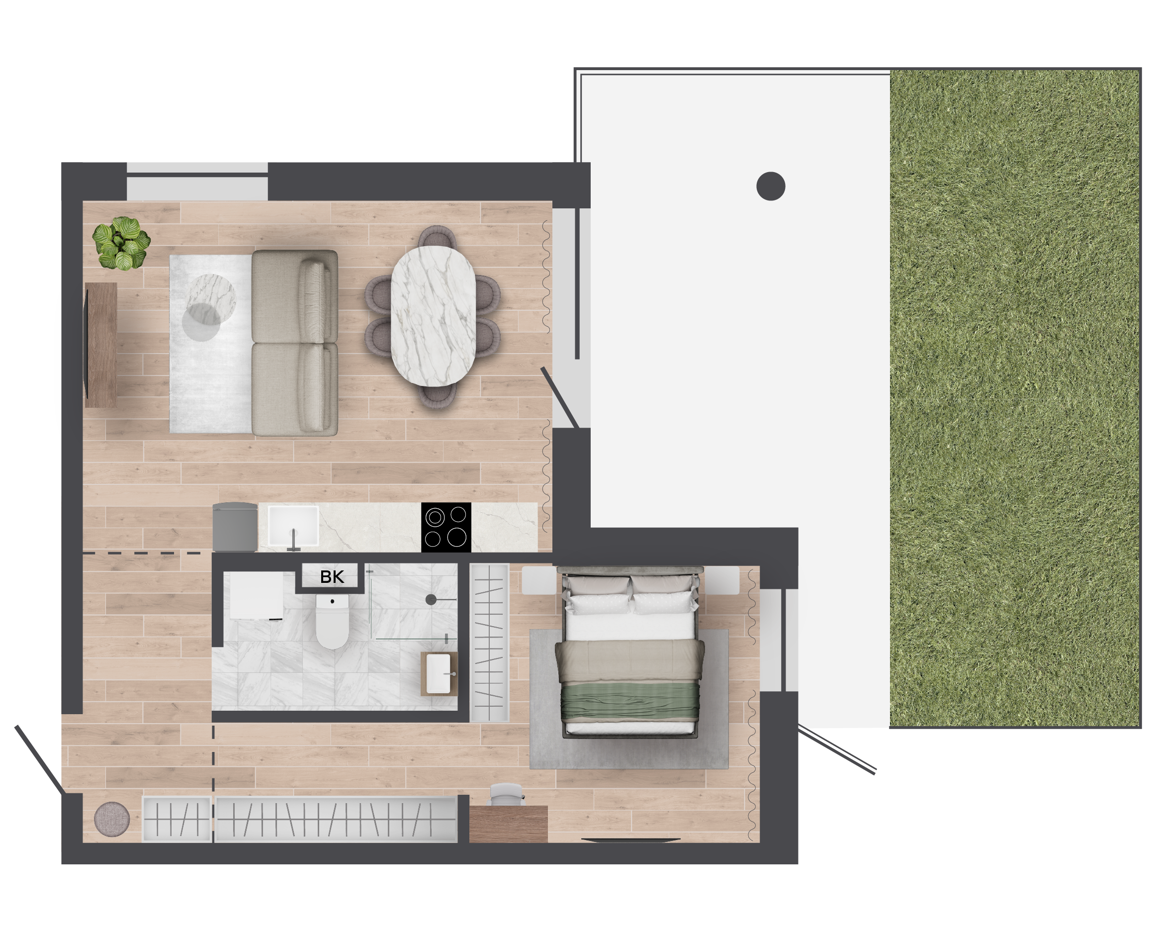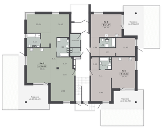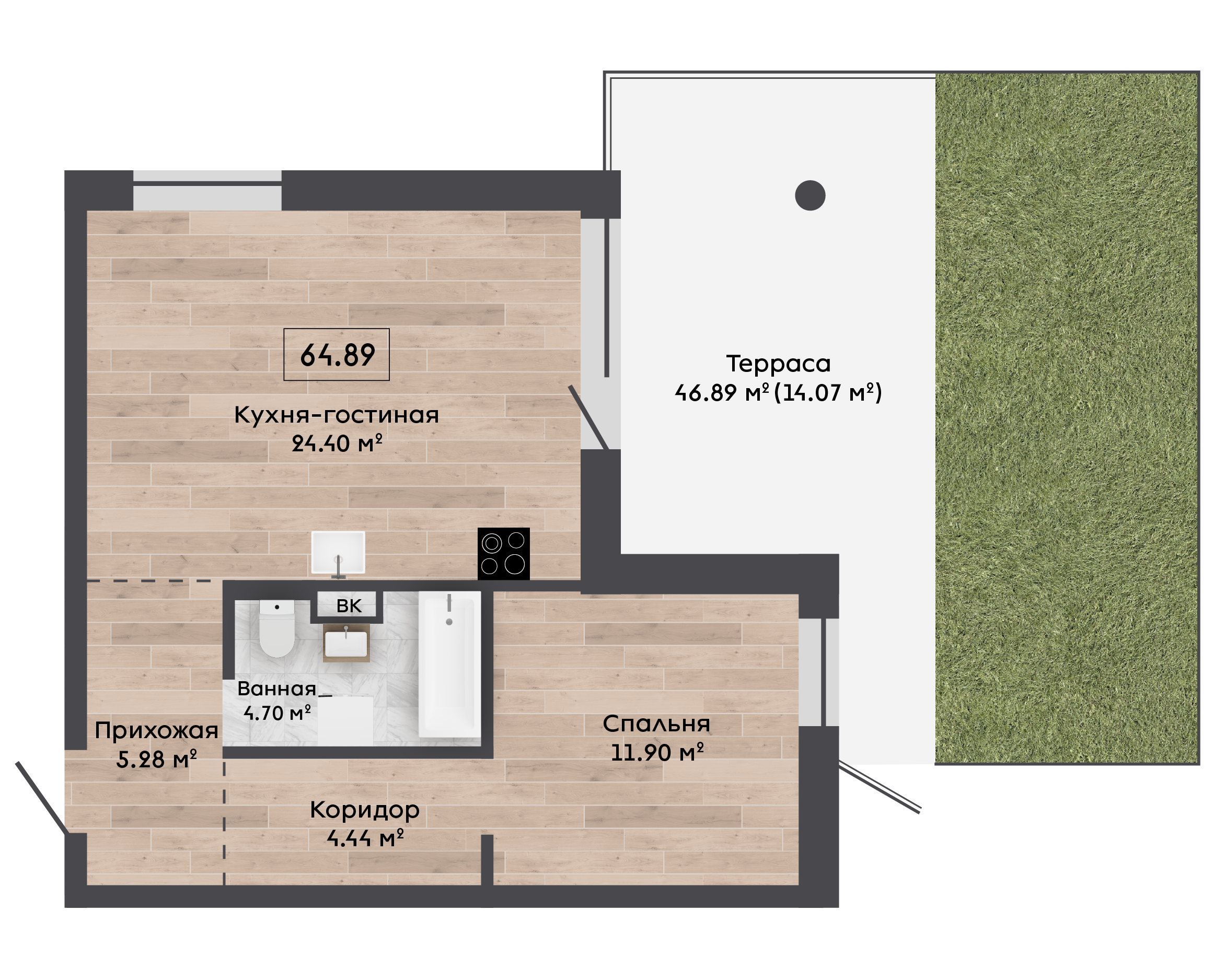 | 64,89 м² Площадь квартиры | 3 м Высота потолков | 46 м² Площадь террасы |
