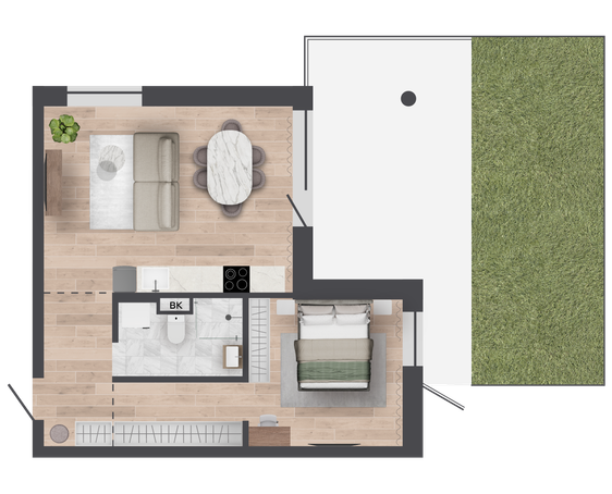 Участки от 16 до 38 квадратных метров дают возможность реализовать множество идей, от создания цветников до установки зон для отдыха с беседками или шезлонгами. Участки приподняты на 0,5 метра над уровнем территории двора и обнесены металлическим ограждением;