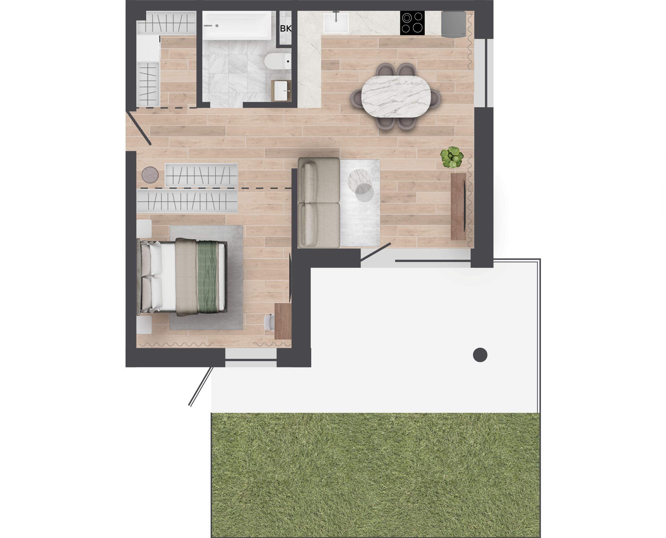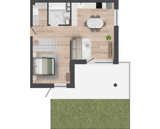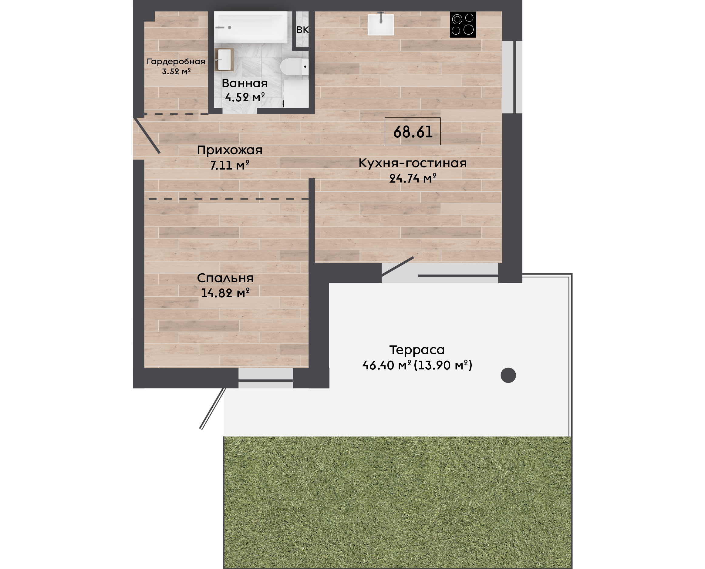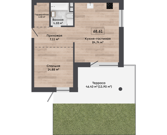 | 68,61 м² Площадь квартиры | 3 м Высота потолков | 46 м² Площадь террасы |