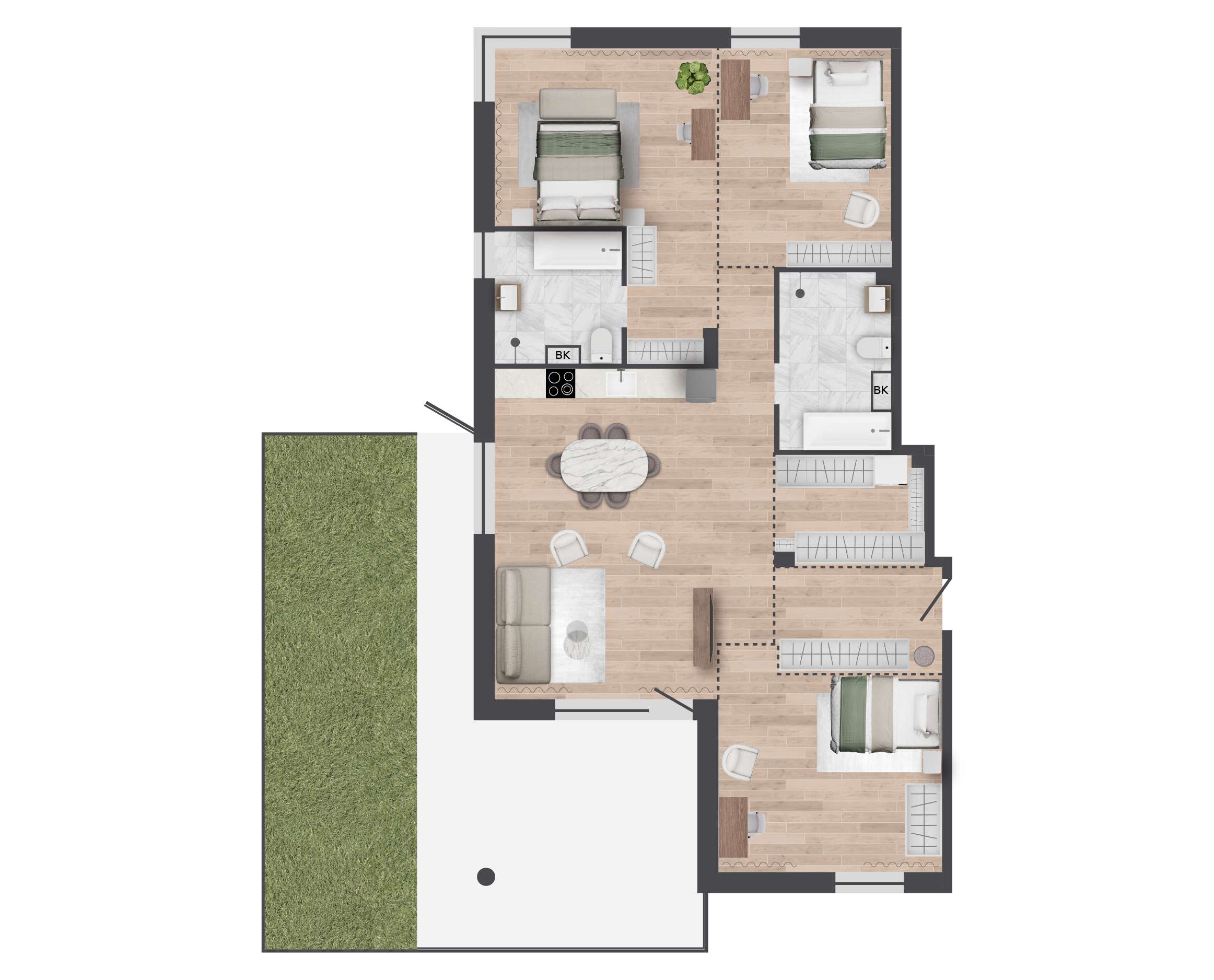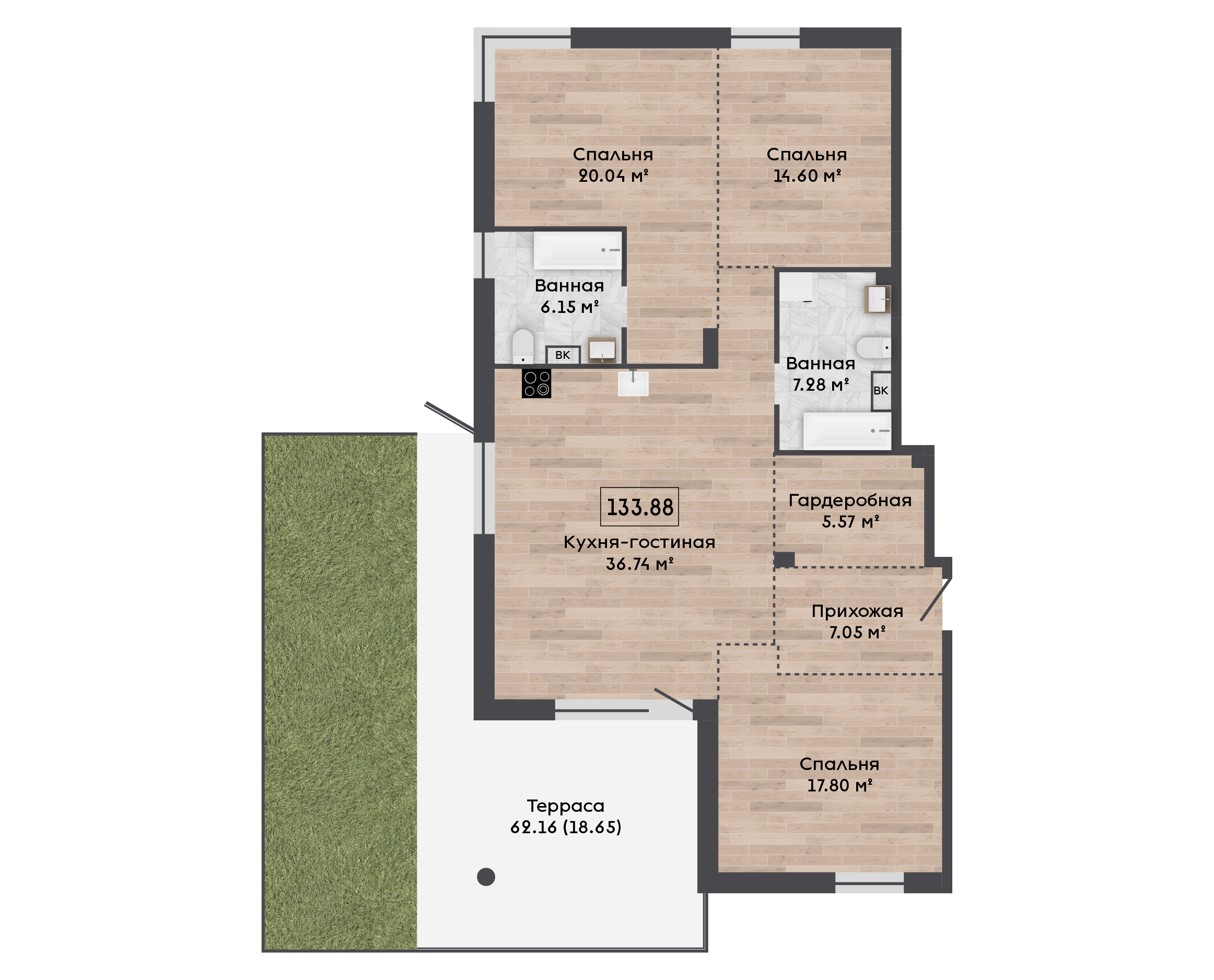 | 133,88 м² Площадь квартиры | 3 м Высота потолков | 62 м² Площадь террасы |