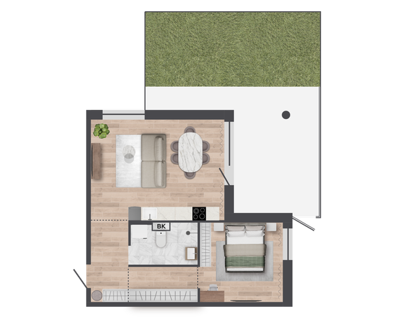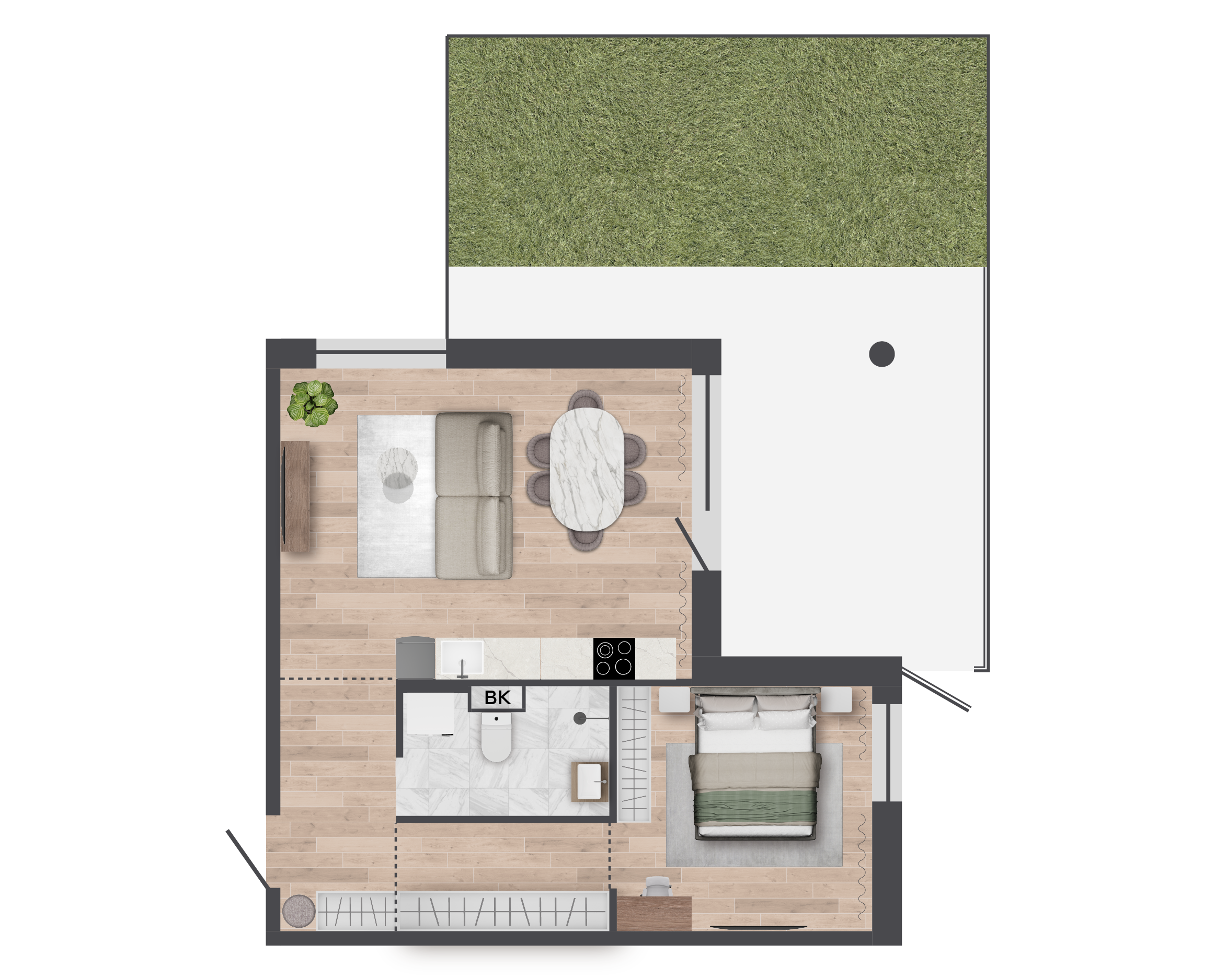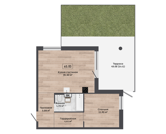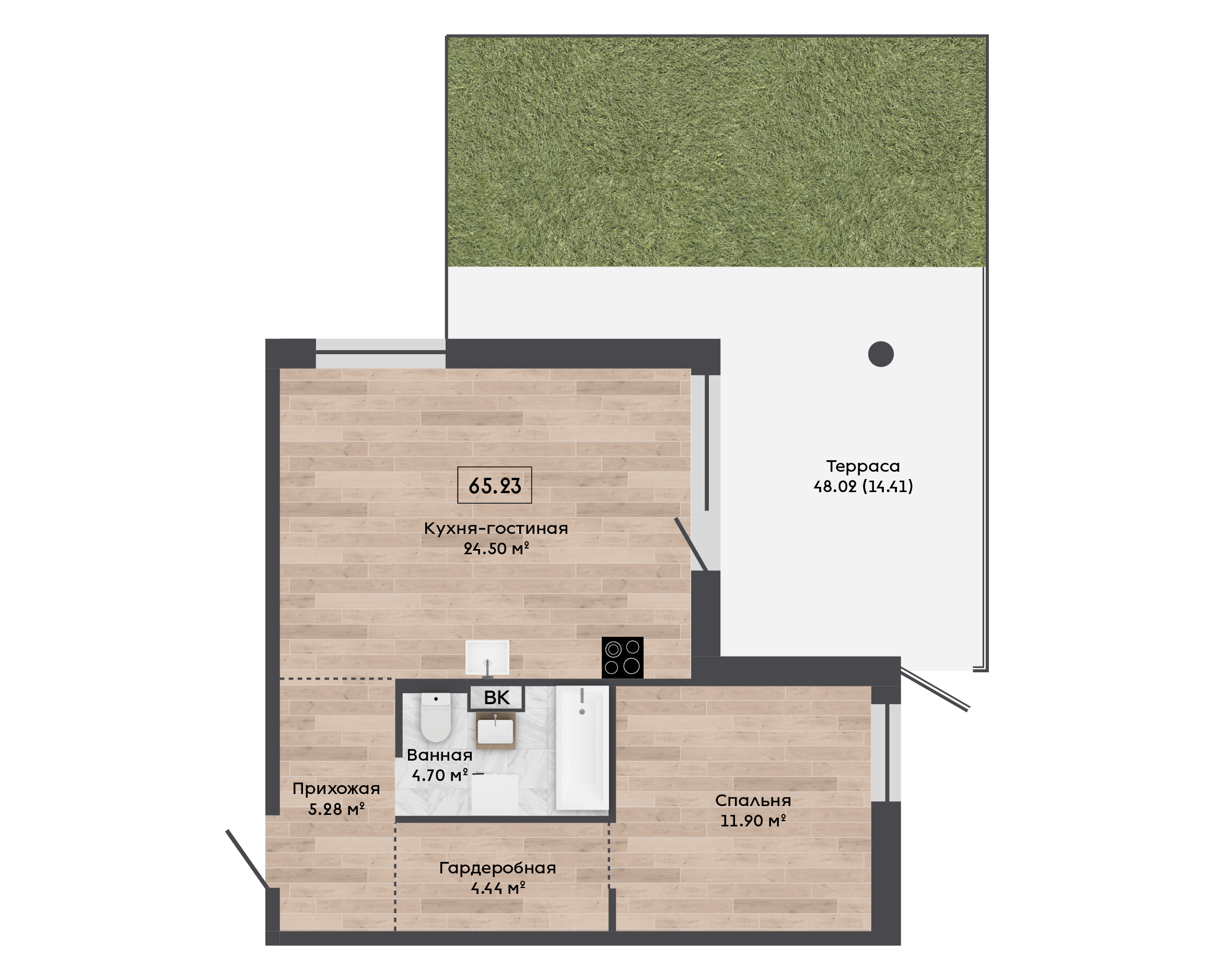 | 65,23 м² Площадь квартиры | 3 м Высота потолков | 48 м² Площадь террасы |