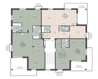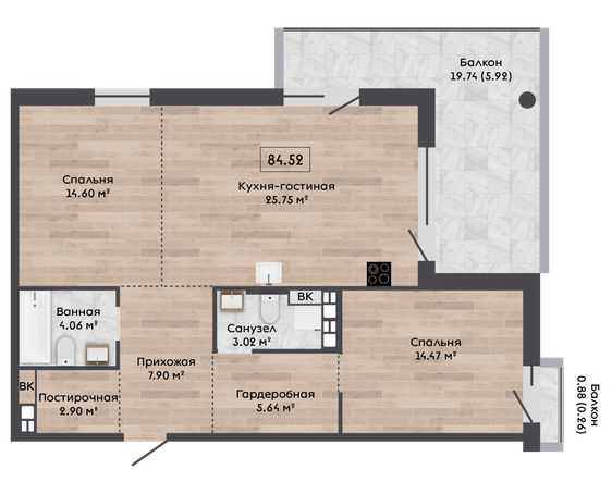 | 84,52 м² Площадь квартиры | 3 м Высота потолков | 19 м² Площадь балкона |