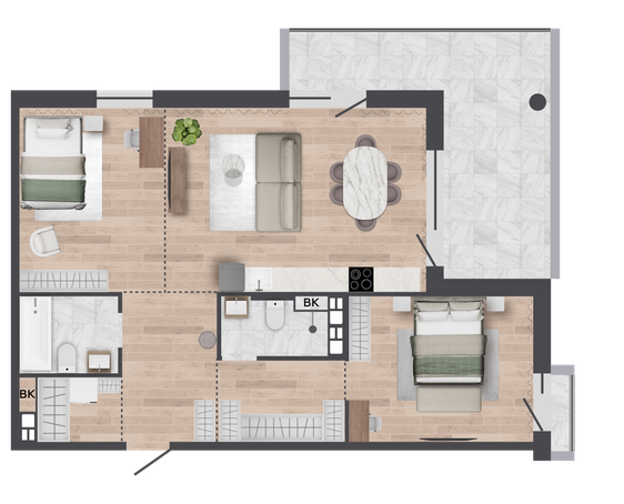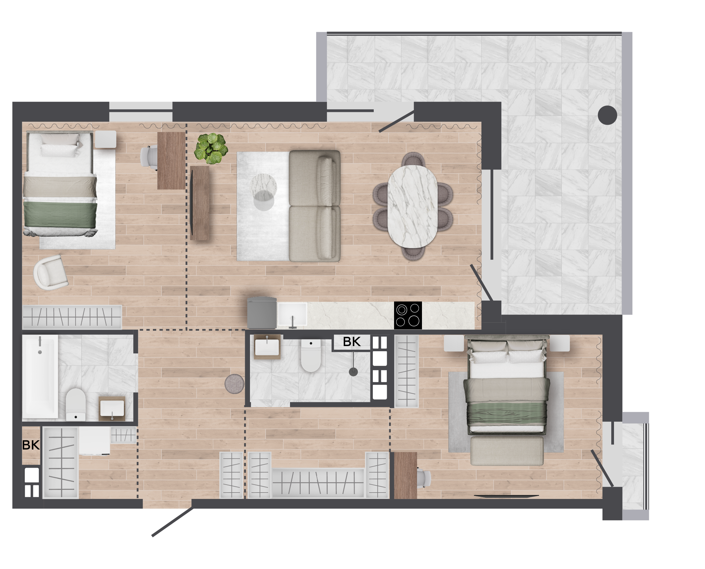 Просторные балконы предоставляют возможность создания уютной зоны отдыха. Здесь можно разместить мягкую мебель, стол для ужинов на открытом воздухе или даже гамак для расслабления;