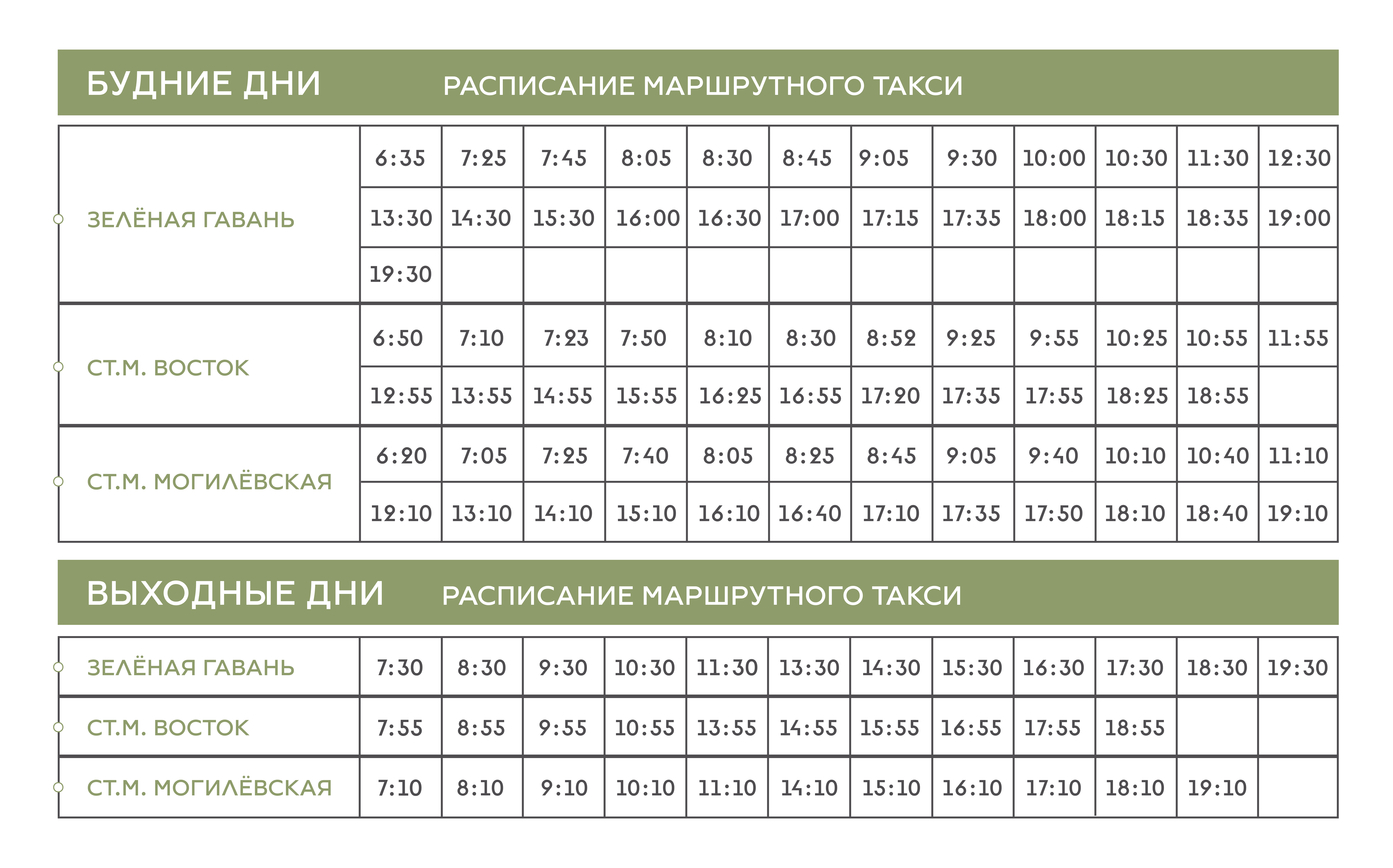 От ЖК Зеленая гавань 7:45, 8:45, 17:15, 18:15.