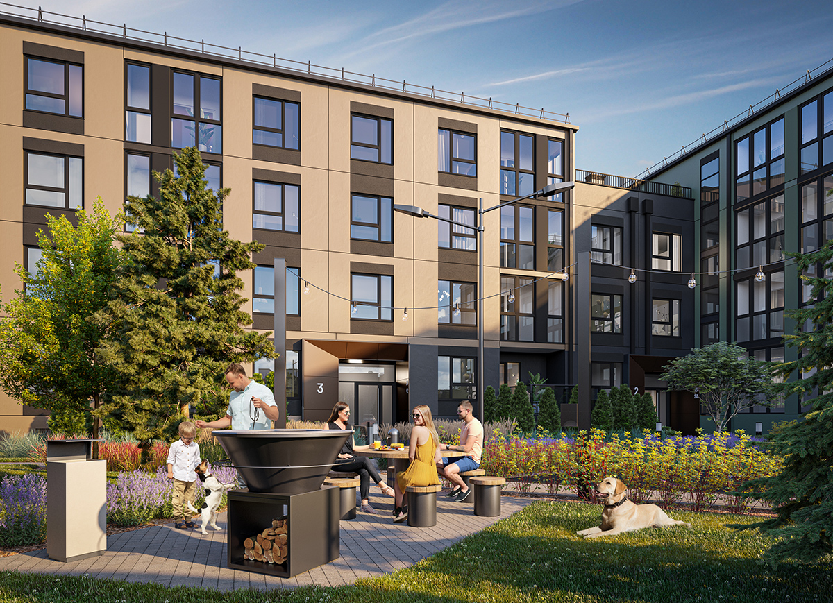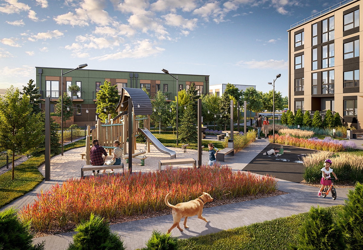 В новом ситихаусе будет 3 подъезда с перепадами высот — от 3 до 4 этажей. На первом этаже в подъездах расположатся общие помещения для мытья домашних животных после прогулки, хранения колясок и велосипедов, а также комната для электросамокатов с зарядной станцией.
