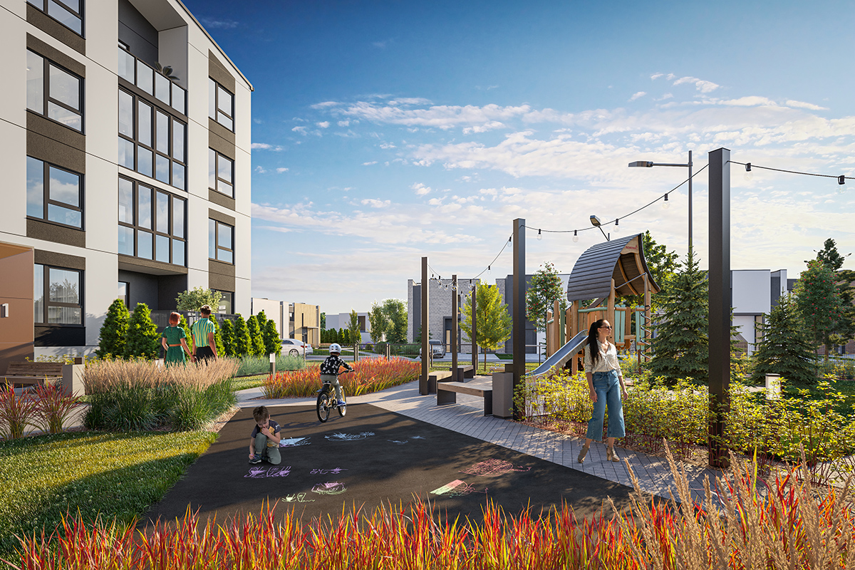 Дом будет иметь закрытый двор, в котором обустроят детскую площадку с небольшой асфальтовой зоной для рисования мелками, территорию отдыха со скамейками и зону барбекю. В каждом подъезде предусмотрено два выхода: во двор и на улицу, к парковкам.