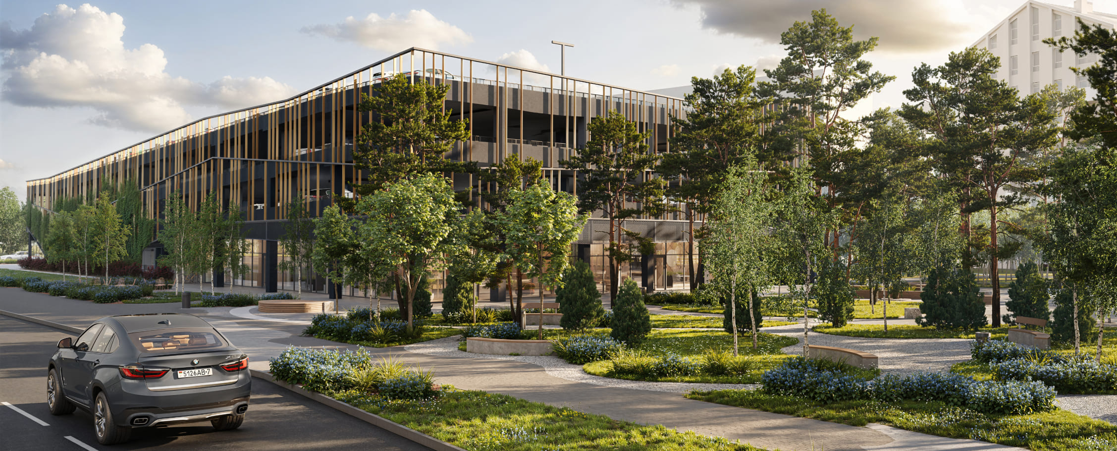 Во дворе предусмотрена детская площадка с защитным навесом и две зоны для тихого отдыха. Будет также соседский центр с павильоном и барбекю, вертикальные мини-огороды и велобоксы. Рядом с ситихаусом будет обустроена большая игровая зона с горками, качелями и веревочным городком, интегрированная в зеленый коридор. Территория рядом с домом будет благоустроена в стиле сада камней. Внутренняя территория будет полностью закрыта от автомобилей. Для личного транспорта в продаже появились места в паркинге под номером 6.13. В нем будут небольшие кладовки (можно будет хранить шины или закатки) и места с зарядными станциями для электромобилей. Рядом также разместится наземная стоянка.